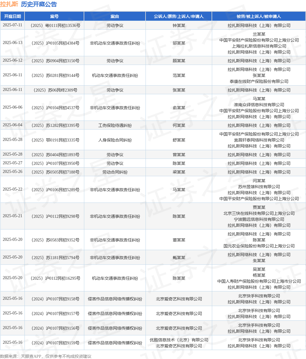 案号:(2025)浙01民终3027号审理法院:杭州市中级人民法院案由:确认劳动关系纠纷当事人信息: 原告/上诉人:孙某某 被告/被上诉人:拉扎斯网络科技(上海)有限公司、上海拉扎斯信息科技有限公司、杭州勇胜餐饮管理有限公司、上海泓弈信息科技有限公司开庭日期:2025年5月13日根据统计,近一年内以拉扎斯网络科技(上海)有限公司为当事人的历史开庭公告有196则,其中案由为“非机动车交通事故责任纠纷”的公告以77则居首,其次为“劳动争议”有33则,“工伤保险待遇纠纷”有27则。历史开庭公告(前20条)如下: